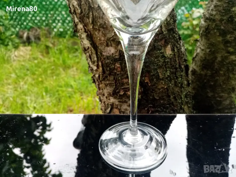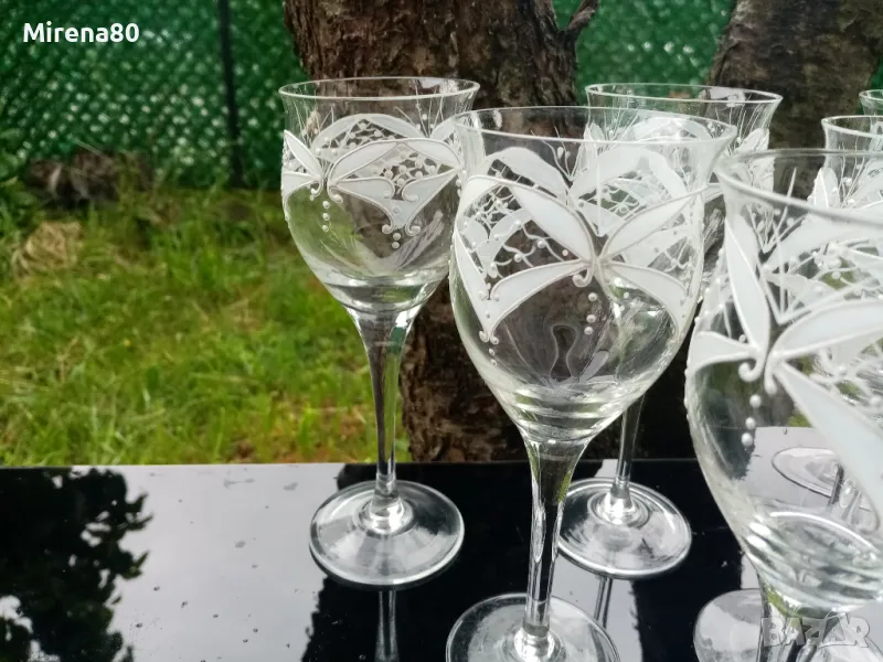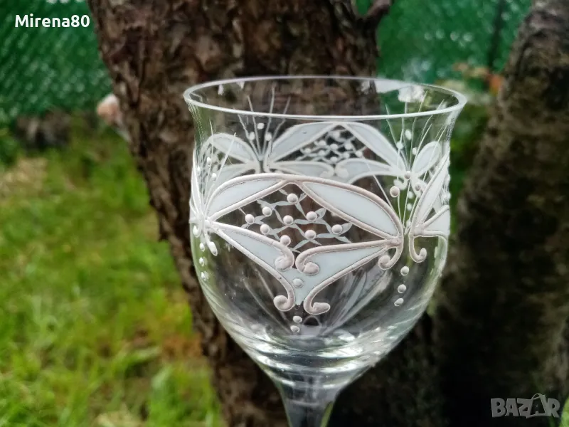 Представям ви един сервиз на СИП - Белослав, на поне 40 години. Чашите са за ракия - 120 мл, във формата на лале и елегантно изваяно столче. Декорацията е релефна и ръчно нанасяна - наподобява дантела - много, много красива ! Чашите са лимитирана, луксозна серия и предполагам, че са били подарък за сватба. Вис. 17, диам. 6 см. Безупречни !
