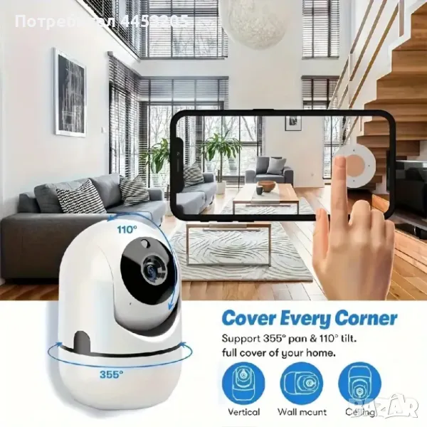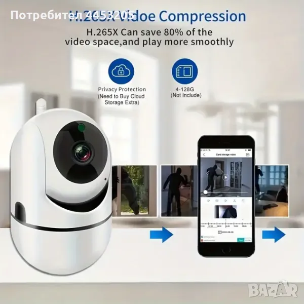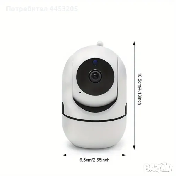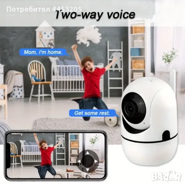 Охранителна камера за видео наблюдение, тип бейбифон с безжична WiFi връзка. Висока резолюция 1920*1080p FullHD 2.0MP. Лесно за наблюдение - директно през телефон, от всяка точка на света. Инфрачервена нощна видимост, съхранение в Облак и SD Карта. Известия от приложението с двупосочно аудио. Захранване чрез USB.. Mоже да се завърта през телефонa на 355° по хоризонтала и 110° по вертикала. Камерата има двупосочно аудио - вградени високоговорител и микрофон, чрез които можете да провеждате видео разговор с човек пред камерата. Управлението и настройките на камерата се осъществяват през телефон, таблет и др. устройства - чрез безплатно мобилно приложение SQCAM за Iphon и Android система.