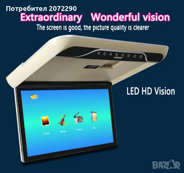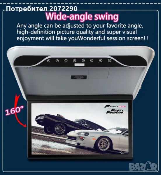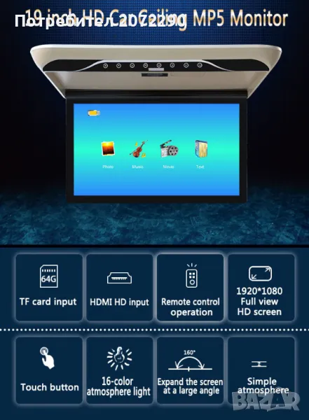 MP5 Flip Down монитор с двупосочен аудио изход + AV + USB/SD + HDMI + FM + MP5 + 2-посочен видео вход + 2-посочен аудио вход + 16-цветна атмосферна фонова светлина