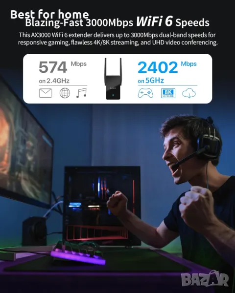 3000Mbps WiFi 6 скорост: Този 4-потоков WiFi 6 ретранслатор осигурява невероятна скорост от 2402Mbps в 5GHz честотната лента и 574Mbps в 2.4GHz честотната лента. Насладете се на бързи игри, безупречен 4K/8K стрийминг и безпроблемни видеоконферентни връзки.