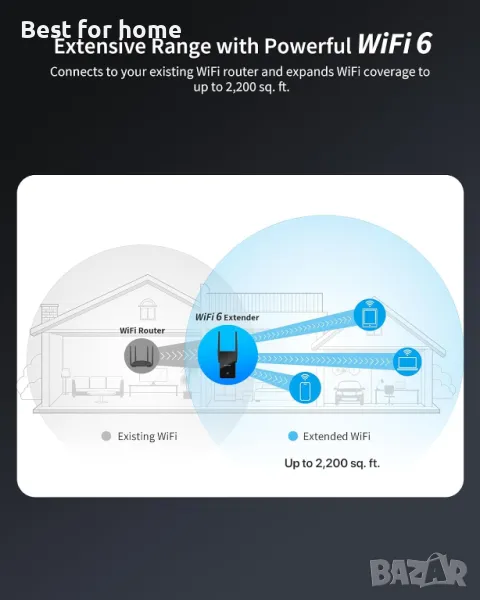 Широк обхват на WiFi: Добавете WiFi 6 ретранслатор към съществуващата си мрежа за превъзходен WiFi в зони от дома ви, където преди не можехте да го имате. Разширете безжичното покритие с до 204㎡ с двубандовия WiFi AX3000.