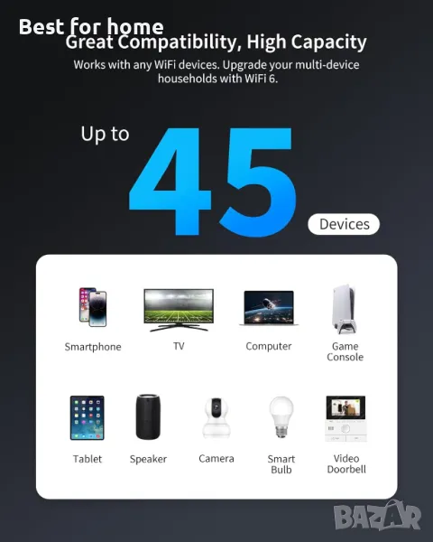 Съвместими устройства Съвместим с всяко WiFi устройство, като смартфони, телевизор, таблет, компютър, игрова конзола, видеодомофон, охранителна камера, принтер, смарт крушка, смарт часовник, смарт термостат, високоговорител и други.