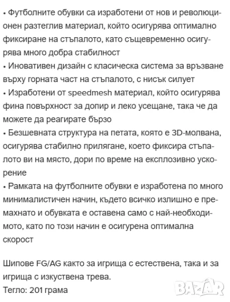 Оригинални и в крак с всички съвременни тенденции, обувките Adidas X 18.1 FG са предназначени за динамична игра на естествена трева. Нископрофилният пръст и еластичният език осигуряват сигурно прилягане. Горната част на „X“ е изработена от най-леката мрежа Speedmesh. Безтегловната външна подметка Speedframe със специални перфорации осигурява светкавично бърза маневреност. Специалната асиметрична система за връзване осигурява най-добрия възможен контакт с топката. Заострените шипове отпред и заоблените шипове отзад, в областта на петата, са пригодени за пълен контрол на играта и несравними реактивни маневри. Готови ли сте да издигнете играта си на следващото ниво? Можете да закупите нови обувки, шпайкове и футзал Adidas X (X) още сега на нашия уебсайт.