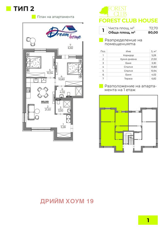Вилата разполага с 4 самостоятелни апартамента. Всеки от апартаментите е с обща площ от 80 кв.м. или чиста такава от 72,70 кв. м. На 1ви жилищен етаж са ситуирани 2 тристайни апартамента със собствен двор от 7кв.м. и се състоят от: коридор- 5,28кв.м.; дневна с кухненска част от 21,50 кв.м.; баня- 3,30 кв.м.; две спални- близо 11кв.м.и втора баня- 4,02кв.м. Във вътрешността на комплекса от къщи ще бъде изграден 24-метров басейн, който ще се отоплява целогодишно.Към апартамента, може да бъде закупено и закрито паркомясто на цена 12 800 евро.