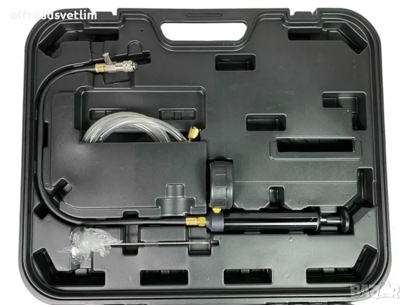 Комплекты включва още манометьр с работно налягане 0-35 psi, помпа с накрайник и бърза вризка, клапан за налягане, както и радиаторни адаптери за тестване на налягане и течове.