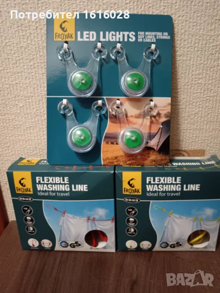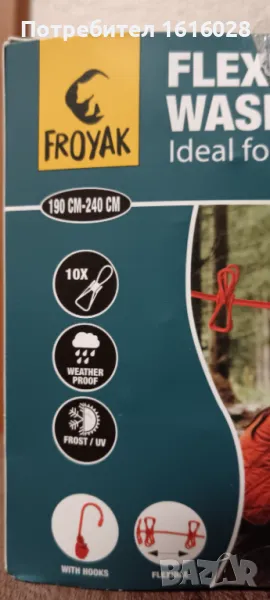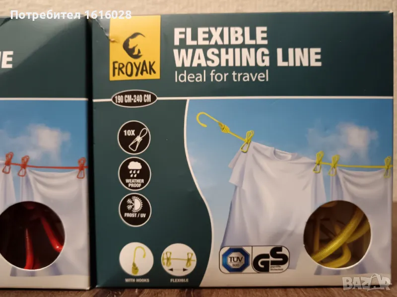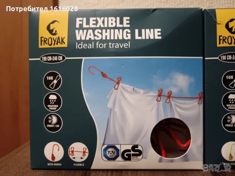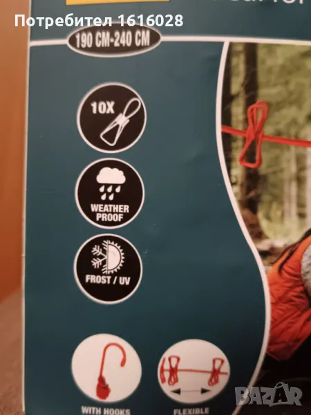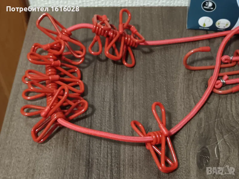 В края въжето е със куки за закачване на клон,въже и др.Щипките се местят по въжето без да се откачат,лесно се пребира в кутията и може да се носи навсякъде при почивка и къмпингуване.