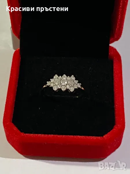 Предлагам прецизно изработен пръстен от английско 9-каратово злато, с общо тегло 1.52 грама. Бижуто е инкрустирано с 19 естествени диаманта/брилянта, които създават впечатляващ блясък и изискано излъчване. Размерът е 54 (вътрешен диаметър 17.2 мм).