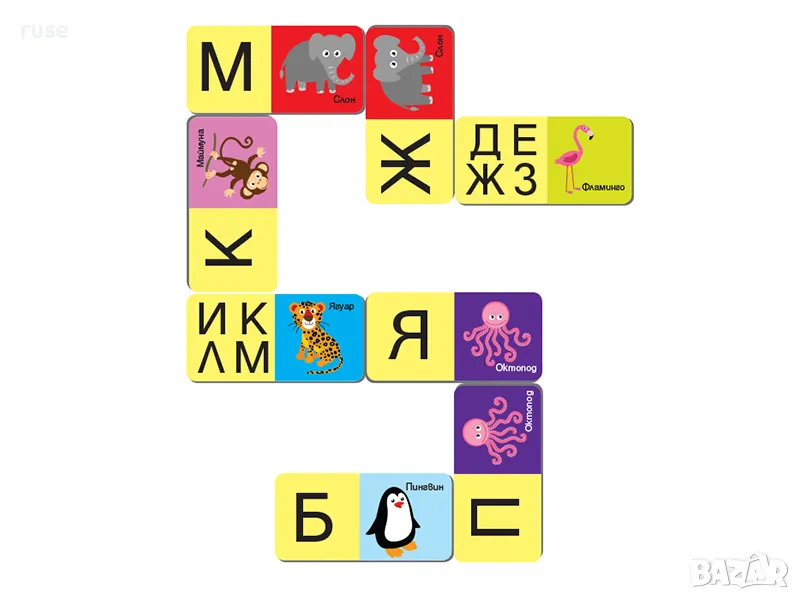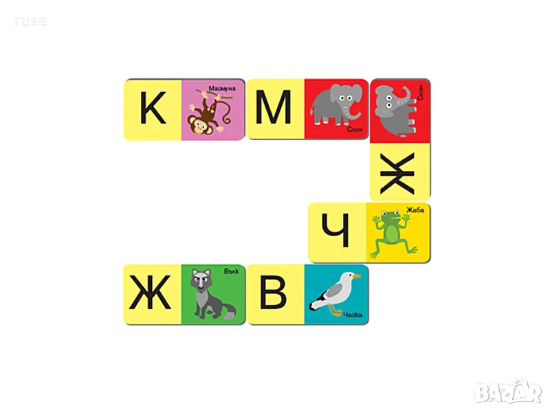 Тази игра съдържа 58 плочки домино, върху които има букви от българската азбука, животни, започващи с тези букви, както и допълнителни бонус плочки.