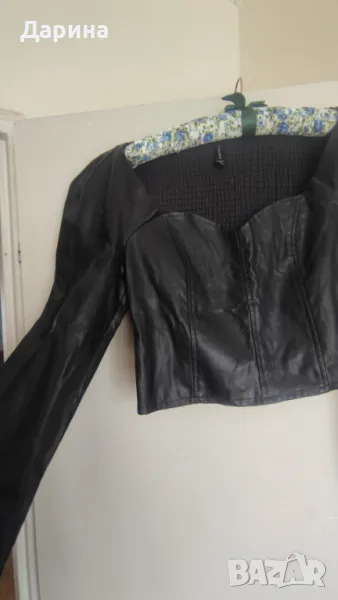 Черна кожена блуза с дълъг ръкав и деколте → Обява 50181936