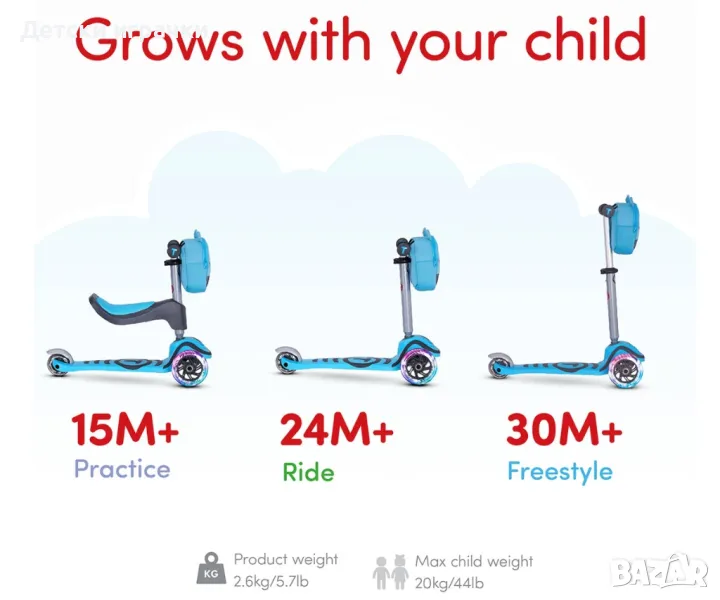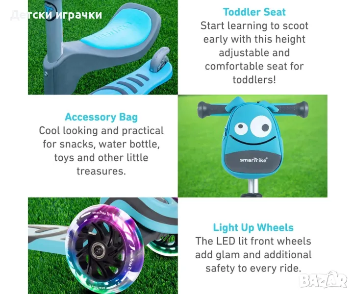 Без значение на кой етап е, скутерът е снабден с много функции, за да осигури на детето максимално удобство и безопасност.