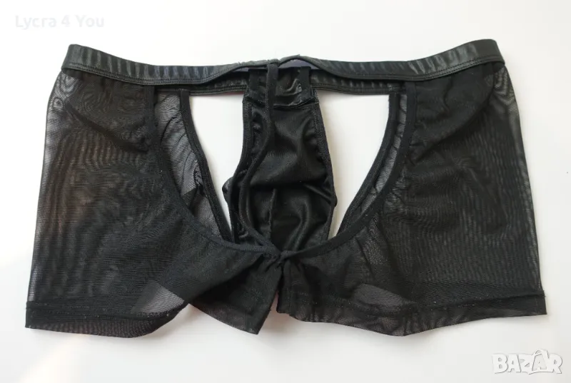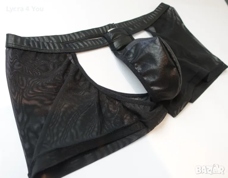 Отпред материята имитира кожен/мокър ефект (коланът на талията е в същата материя отдолу с ластик), отстрани е тюлена и прозрачна. Отзад имат тънка еластична лента в средата на отвора тип прашка.