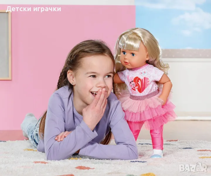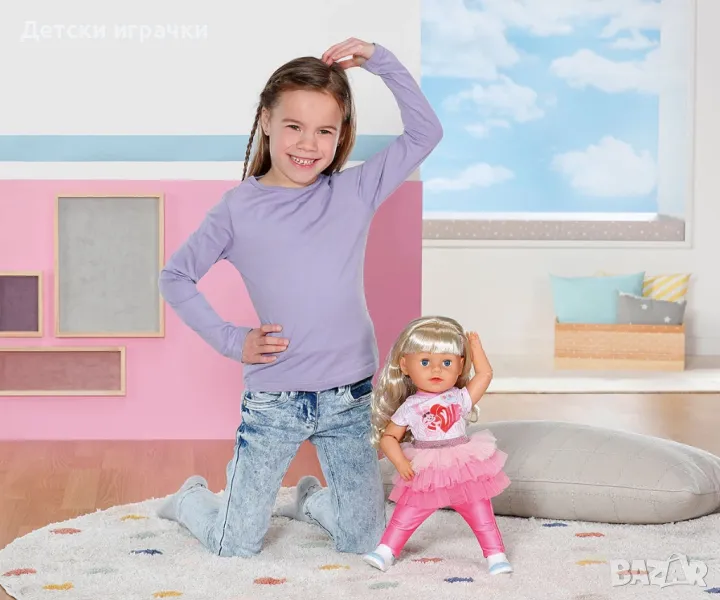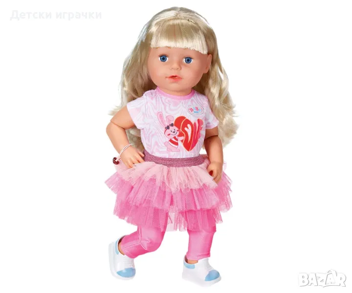 BABY born Sister Style & Play 43 см с комбинезон, пола от тюл и обувки. Включва четка за коса, две спирални връзки за коса, две шноли за коса, две щипки с кичури за коса и по една гривна за приятелство за дете и куклата.