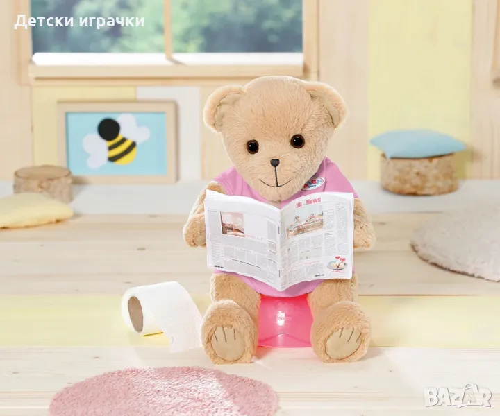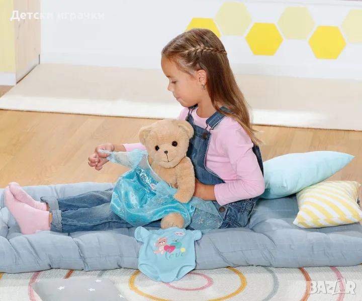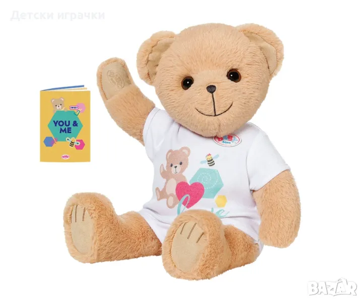 Твоят нов приятел е вече тук - за момичета, момчета и кукли BABY born. Заедно те открива света на BABY born. Те споделят дрехи, аксесоари и прегръдки. Мечето може да бъде каквото искате – момиче, момче или еднорог. Просто със смяна на тоалета (можете да закупите допълнителни дрешки тук) . Нов приятел за игра, който може да бъде облечен и позициониран като кукла, но който е още по-гушкав. Има много плюшени играчки, но само едно мече, което истинските BABY born фенове желаят.