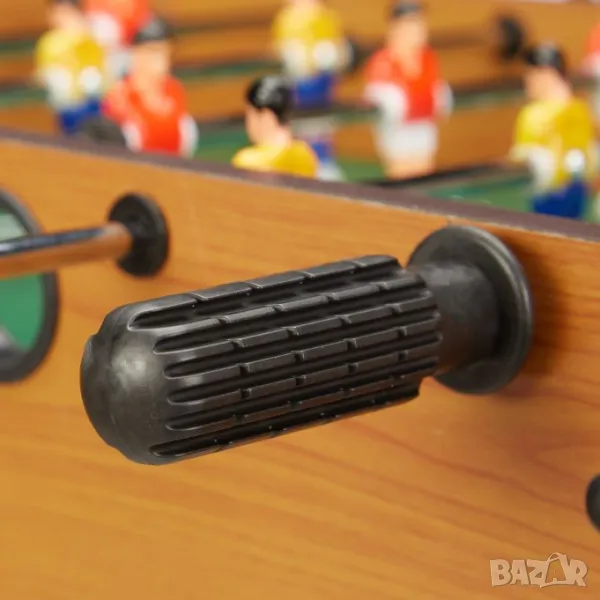 Малките футболни фенове и техните родители ще се забавляват страхотно с тази маса за футбол! Оборудван с общо 6 пръчки и по 3 играчи всяка, този комплект е готов за екшън. Всеки играч управлява своята страна и се опитва да отбележи голове чрез усърдно завъртане, дърпане и бутане на лостовете. Можете ръчно да отбелязвате резултатите на 2 брояча, които варират от 0 до 9. Изработен от издръжлив MDF, този здрав комплект маса се отличава с шикозен дървен вид и е поддържан от 4 здрави крака.