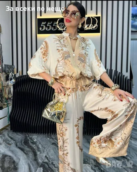 Луксозен комплект тип кимоно, с връзки и цип. Две части, панталон с висока талия и широк крачол.