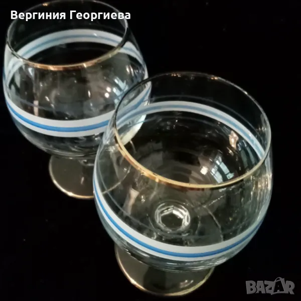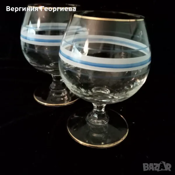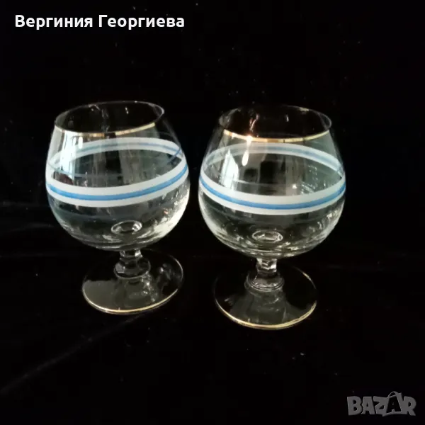 Чаши за коняк с позлата по ръба и по столчето - 2 броя. Височина - 10,5 см, диаметър - 6 см, вместимост - 150 мл. В отлично състояние.