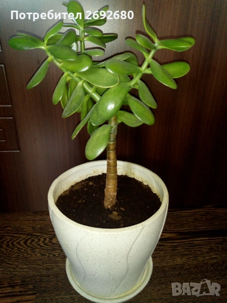 Красула (дървото на живота) в голяма бяла керамична саксия с керамична подложка, височина заедно със саксията - 50см., цена - 50лв.