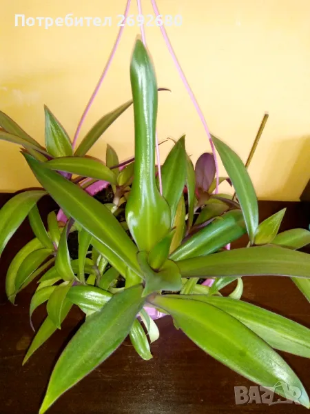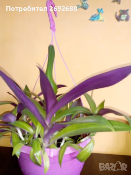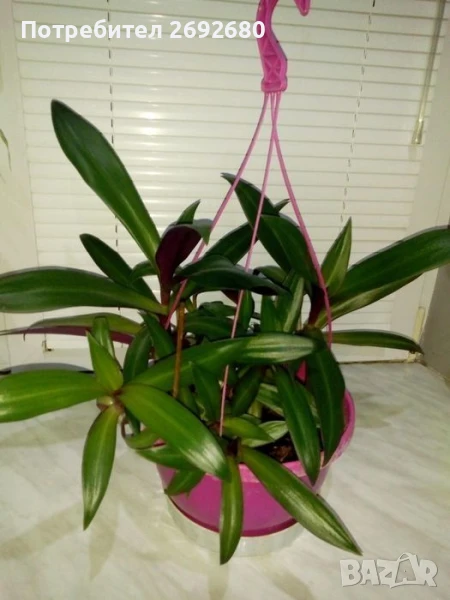 Традесканция рео с ярко-лилави листа от вътрешната страна от първите три снимки, много растения с отделни корени в една голяма саксия за окачване, височина - 70см., ширина - 65см., цена - 8лв.
