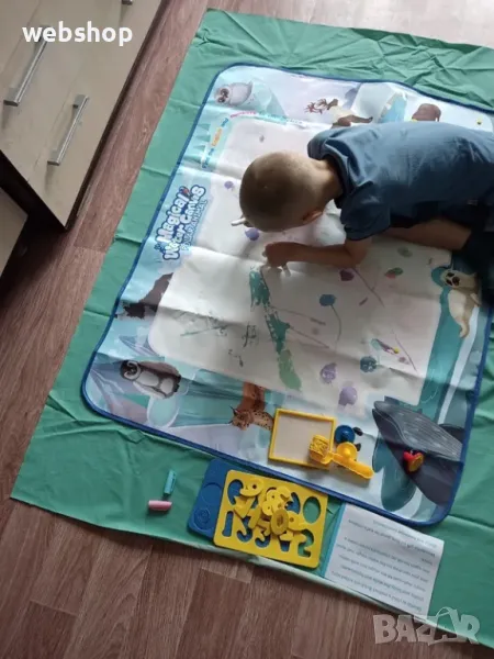 Подложката е с цветен и вдъхновяващ дизайн, заобиколена от интересни и весели илюстрации – животни, природа, цифри, космос и още. Всеки комплект съдържа различни модели и шаблони, които помагат на детето да следва стъпки при рисуване и да усвоява нови умения по забавен и интерактивен начин. Изработена е от лек, но здрав найлонов материал, който позволява лесно сгъване и съхранение. Идеална както за употреба у дома, така и за пътуване, къмпинг или игра навън.