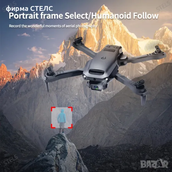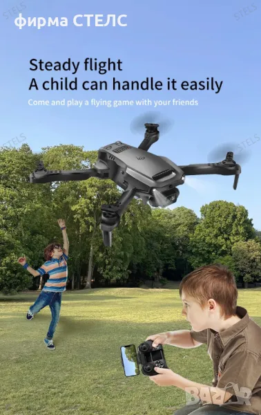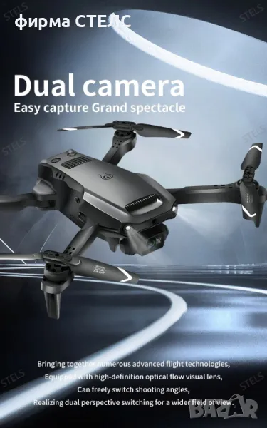 Дрон STELS V36 с две батерии за по-дълъг полет до 40 минути. Има двойна 4K FPV камера за отлични кадри, Wi-Fi управление през телефон и интелигентно избягване на препятствия.