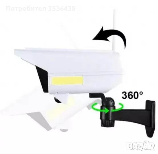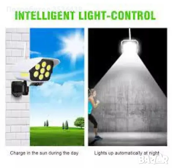 Фалшива камера и LED осветление с вграден сензор за движение и дистанционно управление.ВАЖНО: Инсталирайте продукта на места, където има достатъчно слънцегреене, за да се зареди вградената батерия. Това е гаранция, че ще свети цялата нощ!Режими на работа:1. При засичане на движение диодите светват и гаснат 15 секунди след преминаване на обекта. 2. Постоянно свети на 50% мощност и 100% при наличие на движение.3. Постоянна светлина на 100% през нощта.Предимства:Вградена Li-ion батерия, която се зарежда от соларен панел.Притежава сензор за осветеност - диодите светват само на тъмно.IP66 защита - устойчива на всякакви атмосферни влияния. Подходяща за външен монтаж.Вграден датчик за движение с обхват 3-5 метра.Три режима на работа, който се избират дистанционно.Червена премигваща светлина, за по-реалистична визия.Ярка светлина от 7 COB диоди с висока яркост и два матрични осветители отстрани.Технически параметри:Захранване: вградена LI-ion батерия, тип 18650, капацитет 2600mAh;Соларен панел: 5.5v/300mAh;Цвят на светлината: студено-бяла 6500K;Корпус: ABS, водоустойчив;Светлина: 113COB + 18 COB от всяка страна;Обхват на детектора за движение: до 5 метра и хоризонтален ъгъл 120 градуса;Време за зареждане: 4-6 часа;Време на светене: до 8 часа /постоянно/.Този продукт е идеален избор за охрана и осветление на дворове, паркинги, градини, пчелини и други обекти без ток.