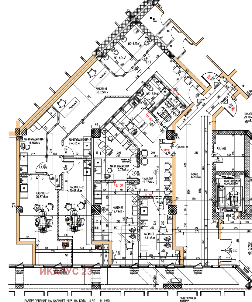 Състои се от: Приемна зона + чакалня, 2бр рецепция, 2бр Кабинети, 2бр манипулационни,2бр санитарен възел.