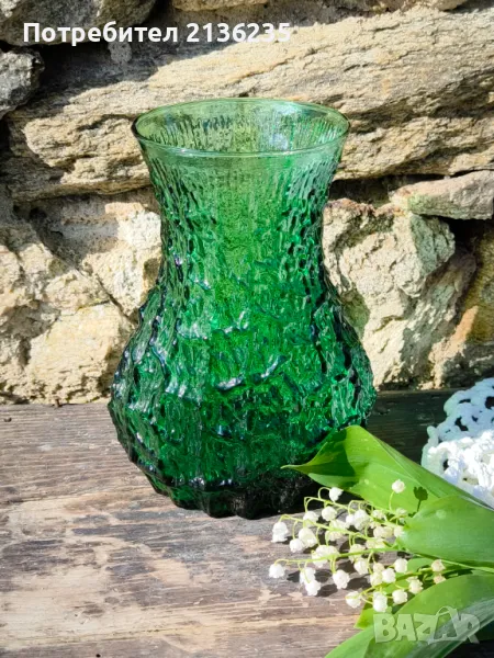 Предлагам красива винтидж ваза в наситен изумруденозелен цвят, с изразена релефна повърхност в стил „лавова текстура“ или „дървесна кора“. Масивна, стабилна и с изразителен винтидж характер – подходяща както за декорация, така и за ежедневна употреба.