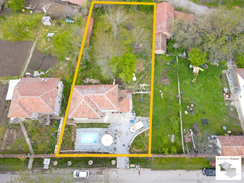 Имотът е разположен в просторен двор от 1400 кв.м., с частен басейн в предната част и стопанска постройка в задния двор.