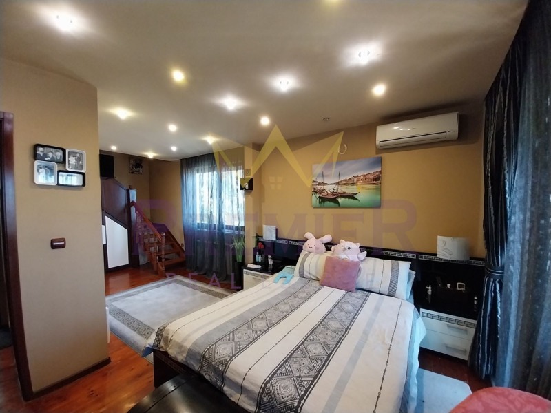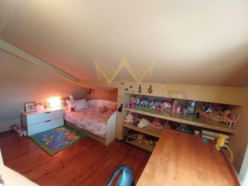 Вътрешното стълбище води към второ ниво което е обособено със спално помещение, детска стая с дрешник, санитарен възел и тераса.