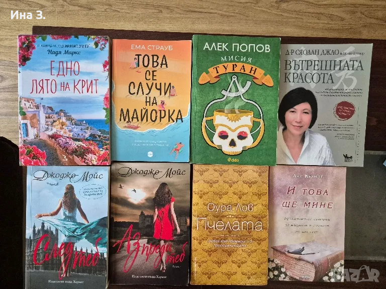 Книгите са с нормални следи от употреба - Другата двойка 10 лв, Констанс ФАНТАСТИКА /много добра/ 10 лв. Едно лято на Крит лека, романтична 10 лв., Мисия Туран супер чудесен хумор, лека и забавна, 10 лв., Аз преди теб и След теб, Това се случи на Майорка и Пчелата НЕ СА НАЛИЧНИ.