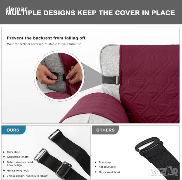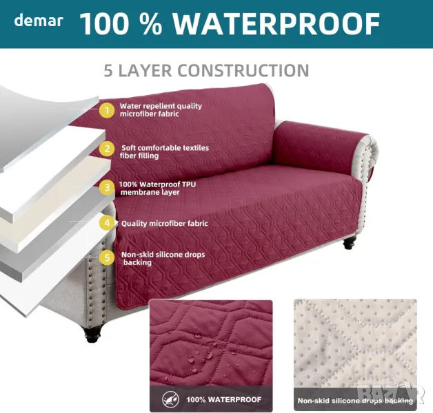 Този водоустойчив калъф за 3-местен диван е изработен от пет издръжливи слоя плат, включително водоустойчива TPU мембрана и противоплъзгаща се подложка, предлагащи пълна защита и дълготрайна употреба. Той е с двоен противоплъзгащ дизайн с еластична долна лента и гранулирана противоплъзгаща се подложка, за да го държи здраво на място. Шест удобни джоба за съхранение на подлакътниците осигуряват място за дистанционни управления, списания или таблети. Повърхността е водоотблъскваща, което помага за поддържането на мебелите чисти и свежи, особено в домове с домашни любимци или деца. Може да се пере в пералня (само да се суши на въздух) и е лесен за поставяне или сваляне.