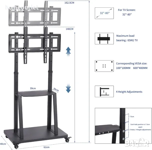 Нашата стойка за телевизор е подходяща за повечето 32-80 инча телевизори с плосък панел и тегло до 60 кг.