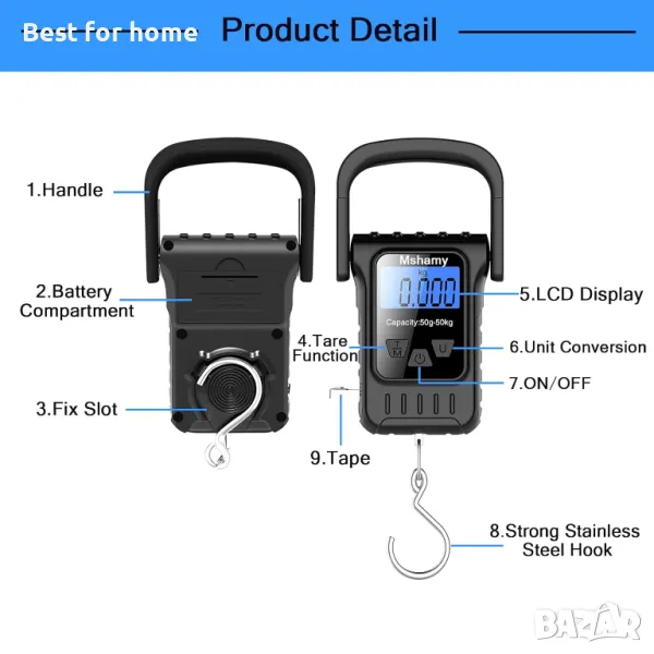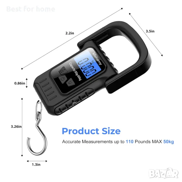 110 lbs/50 kg, Везна за багаж, Висяща везна, Риболовни везни с LCD дисплей, Цифрови пощенски везни с голяма дръжка, измервателна лента, Необходими са 2 AAA батерии