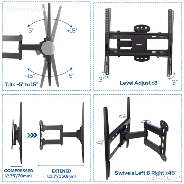 Стенната стойка за телевизор е подходяща за повечето 32-55 инчови телевизори до 45 кг (99 фунта) с макс. VESA от 400 мм x 400 мм/16" X 16" разстояние между дупките за монтаж.