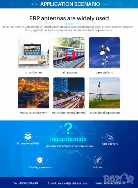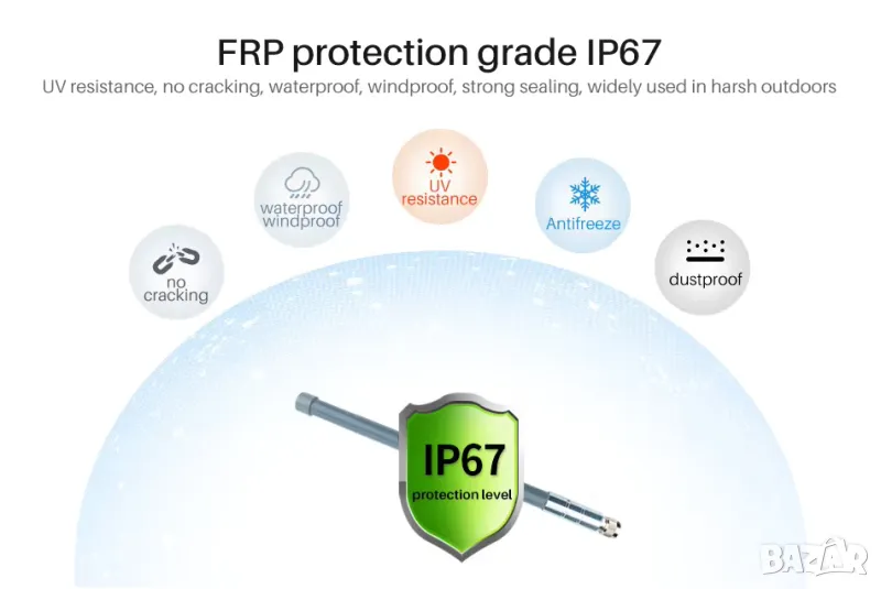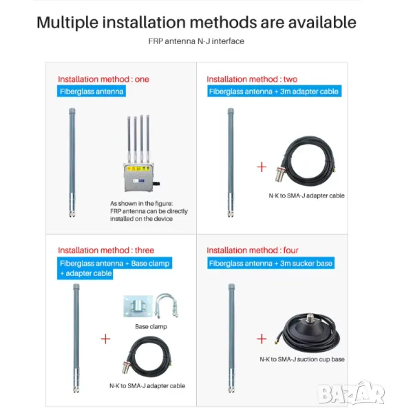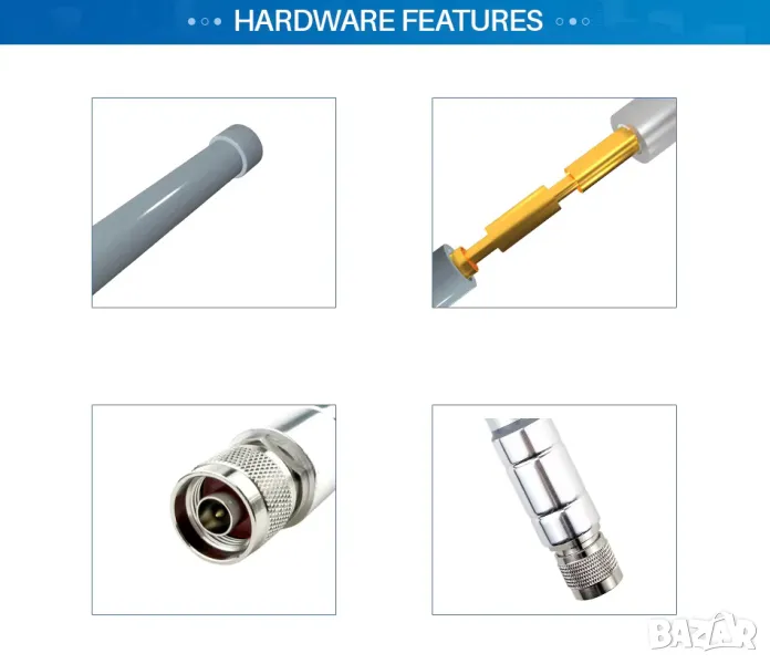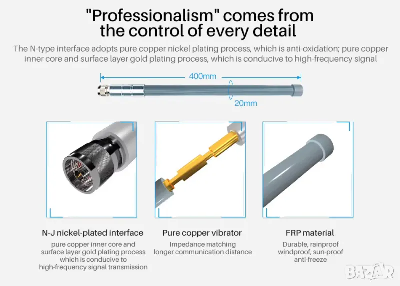 Професионален конектор и издръжливост: Оборудвана е с N-J (N-Type) конектор, известен със своята здравина и надеждност при външни условия. Самата антена е изработена от влакнесто стъкло, което я прави лека, но изключително устойчива на UV лъчи, влага и корозия (често с клас на защита IPX5 или по-висок).