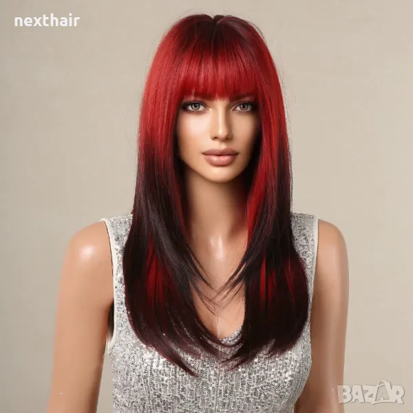 Ефектна омбре перука черно червена с бретон 60 см → Обява 50191899