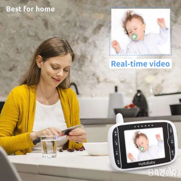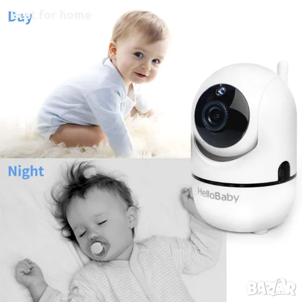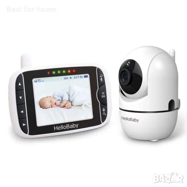 Видео бебефон HelloBaby с дистанционна камера, панорамиране, накланяне и мащабиране, 3.2'' цветен LCD екран, инфрачервено нощно виждане, температурен дисплей, приспивна песен, двупосочно аудио