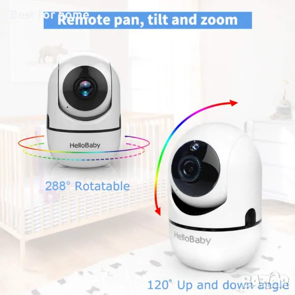 Камерата с дистанционно управление се завърта на 288° хоризонтално и 120° вертикално, което ви осигурява ясна видимост към бебето ви от всеки ъгъл. Няма нужда да влизате в стаята на бебето, за да регулирате камерата - ще виждате цялата стая ясно, денем или нощем, с дистанционно управление на панорамиране, накланяне и мащабиране.