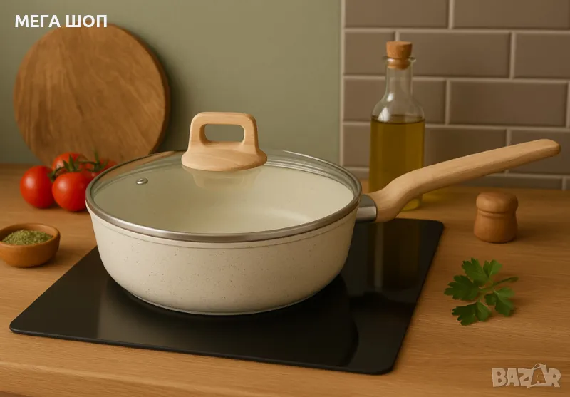 Тиган с капак Voltz Nice , Дълбок, Кован алуминий, Мраморно покр., Индукция, Кремав меланж → Обява 50192136