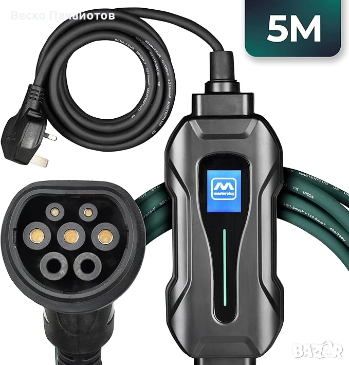 Заряден кабел Masterplug ОРИГИНАЛЕН на Сериозна Английска Фирма нищо общо с китайските- за електрически и хибридни превозни средства, 5 метра, режим 2, 3-пинов UK щепсел към зарядно за кола тип 2, 2.4kW, EVCM221005. Намален с 50%