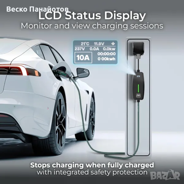 - LCD ДИСПЛЕЙ ЗА СЪСТОЯНИЕ НА ЗАРЕЖДАНЕТО: Показва ви състоянието на зареждането и спира зареждането, когато превозното средство е напълно заредено, с вградена безопасна защита за PEN повреди, защита от пренапрежение/под напрежение, термично претоварване и 30mA AC и 6mA DC RCD.
