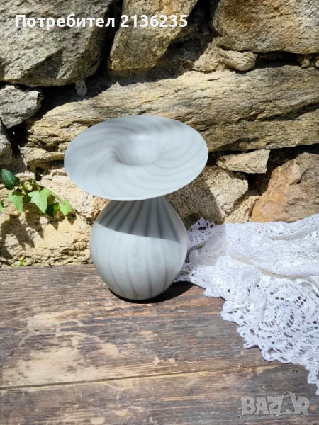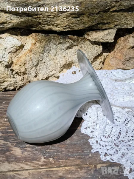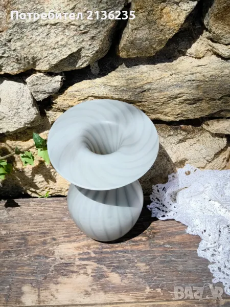 Предлагам впечатляваща ваза от матово художествено стъкло в сивкав мраморен десен. Формата е органична и смело модернистична – с широко, спираловидно гърло, напомнящо вихър или торнадо. Вазата е стабилна, с балансирана тежест и фино въртеливо шарене по цялото тяло.