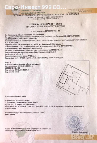 АПАРТАМЕНТЪТ е с площ по документ 77 кв.м, ведно с прилежащите му 4,50 кв.м. идеални части от общите части на сградата, ведно с 1,505 % идеални части от поземления имот, в който е построена сградата. Жилището е разположено в десет-етажна стомано-бетонова сграда представляваща "Многофункционална Обществена Сграда" с адрес: