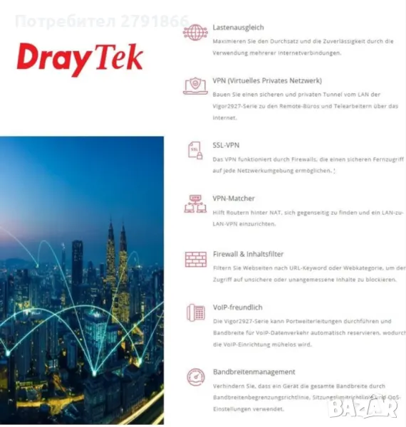 - Разширена функционалност на рутера DrayTek, включително филтриране на съдържание по категории и качество на услугата на ниво приложение.
