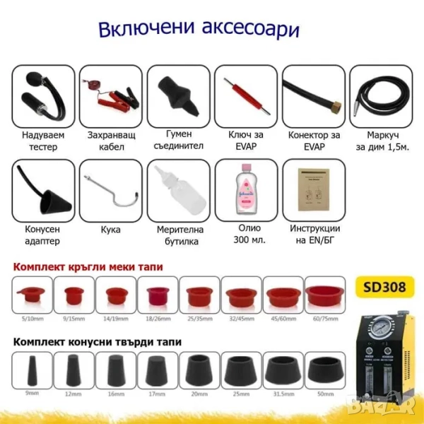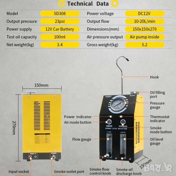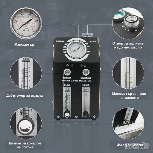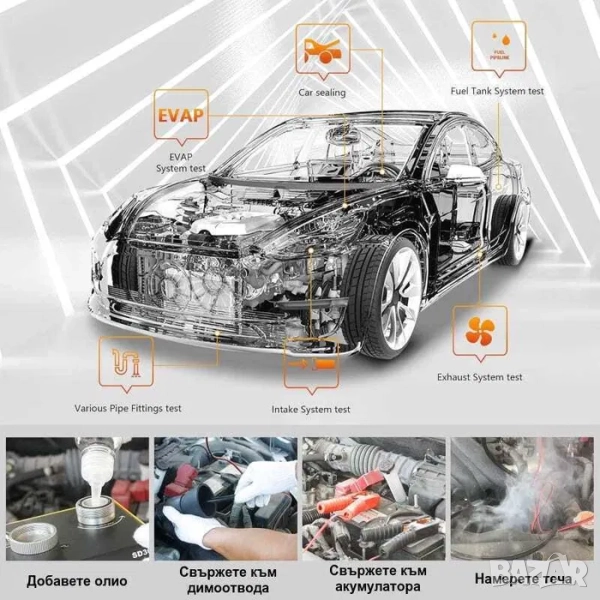 Димен детектор за диагностика на тръбната система и турбо пътища във всички видове автомобили, камиони и други. Двоен режим на работа, 12V