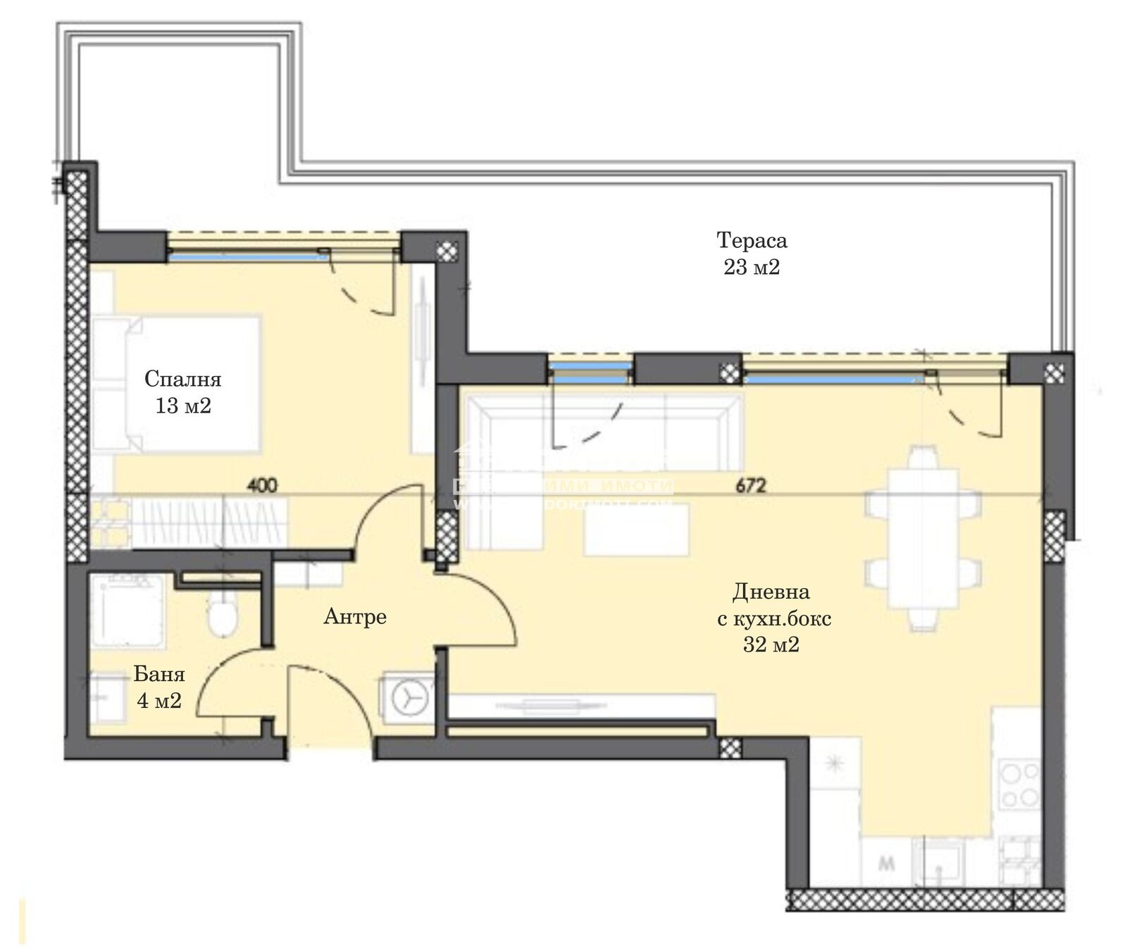 Оферта 66803: Предлагаме Ви възможността да закупите 2 - стаен апартамент в новоизграждащ се луксозен жилищен комплекс с модерна визия, проектиран да създаде максимален комфорт на живущите в него. Функционално разположени жилищни секции с елегантен силует готов да предложи комфорт и модерен начин на живот. Едно от основните му предимства е страхотната локация, отлична комуникативност и динамична пътна инфраструктура, която осигурява бърз и лесен достъп до комплекса от всяка точка на града. Той съчетава лукс, спокойствие и комфорт с подсигурени паркоместа и гаражи. Жилището се състои от просторна дневна/32 кв.м./ с кухненска част и трапезария, една самостоятелна спалня 13 кв.м., баня с тоалетна, входно антре с място за перално и една панорамна тераса. Основната концепция при проектирането е да се постигнат просторни и функционални стаи, с цел да се създаде максимален уют на модерното семейство. Изключителна съвременна архитектура и модерна технология на строителство. Визията е иновативна, привличаща внимание с уникалността си. Всяко жилище ще разполага с пълно окабеляване за домофон, интернет и кабелна телевизия, общите части са луксозно завършени, жилищата са с алуминиева дограма с троен стъклопакет от най-висок клас, масивна блиндирана входна врата. За удобство на живущите съществува възможността да закупят подземни паркоместа и гаражи с топла връзка към комплекса. Гъвкави схеми на разсрочено плащане спрямо възможностите на клиента в рамките на строителството или закупуване чрез Банков Кредит, на изключително изгодни условия за клиенти на агенцията !!! Приложените изображения са от завършени проекти на строителната фирма.ВИЖТЕ ОЩЕ ИЗГОДНИ ОФЕРТИ НА https://www.kondorimoti.com/ С ЕЖЕДНЕВНА АКТУАЛИЗАЦИЯ!