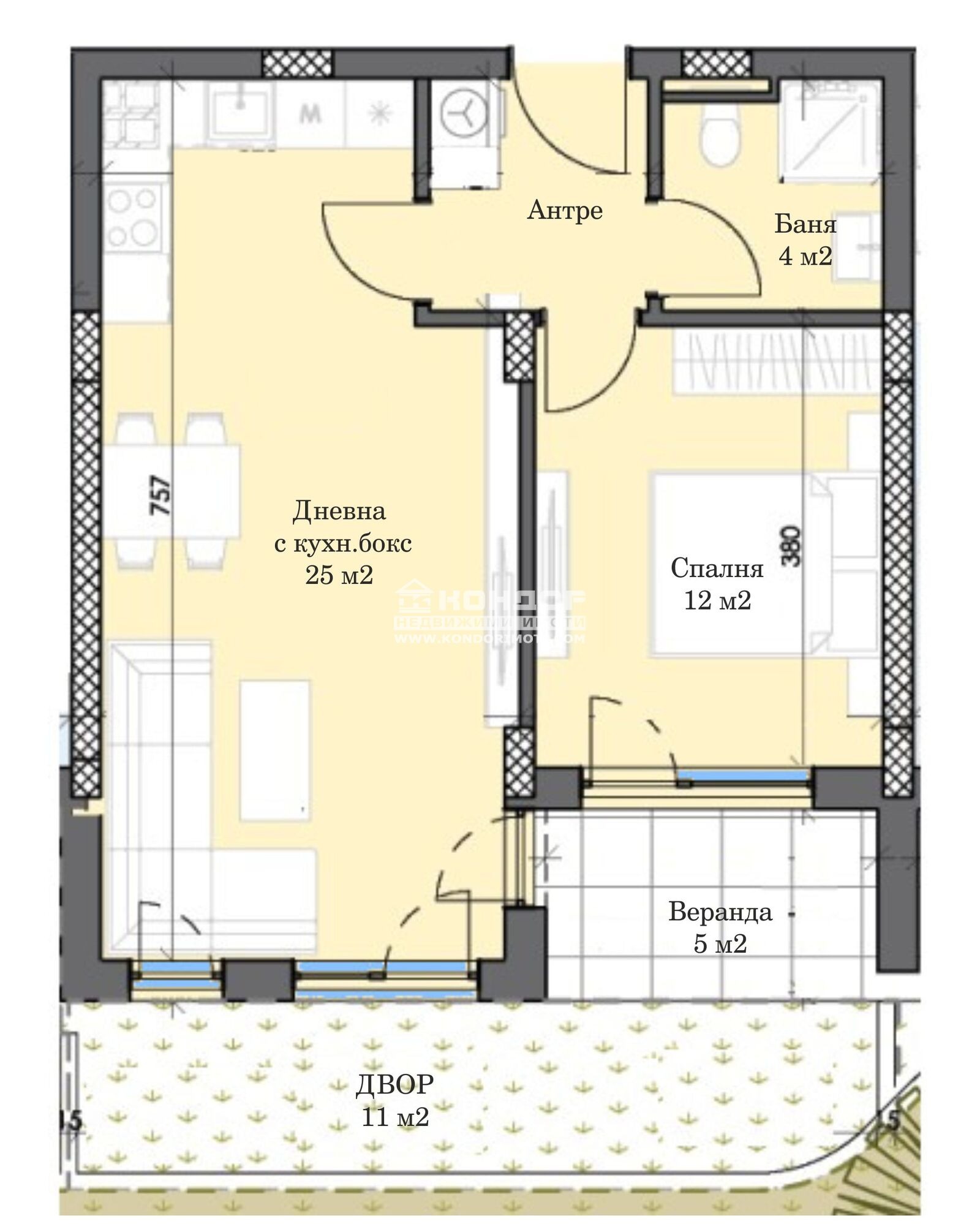 Оферта 66819: Предлагаме Ви възможността да закупите двустаен апартамент с изцяло южно изложение в новоизграждащ се луксозен жилищен комплекс с модерна визия, проектиран да създаде максимален комфорт на живущите в него. Функционално разположени жилищни секции с елегантен силует готов да предложи комфорт и модерен начин на живот. Едно от основните му предимства е страхотната локация, отлична комуникативност и динамична пътна инфраструктура, която осигурява бърз и лесен достъп до комплекса от всяка точка на града. Той съчетава лукс, спокойствие и комфорт с подсигурени паркоместа и гаражи. Жилището се състои от дневна 25кв.м. с кухненска част и трапезария, една самостоятелна спалня, баня с тоалетна, входно антре с място за перално, веранда и собствен двор 11кв.м. Основната концепция при проектирането е да се постигнат просторни и функционални стаи, с цел да се създаде максимален уют на модерното семейство. Изключителна съвременна архитектура и модерна технология на строителство. Визията е иновативна, привличаща внимание с уникалността си. Всяко жилище ще разполага с пълно окабеляване за домофон, интернет и кабелна телевизия, общите части са луксозно завършени, жилищата са с алуминиева дограма с троен стъклопакет от най-висок клас, масивна блиндирана входна врата. За удобство на живущите съществува възможността да закупят подземни паркоместа и гаражи с топла връзка към комплекса. Гъвкави схеми на разсрочено плащане спрямо възможностите на клиента в рамките на строителството или закупуване чрез Банков Кредит, на изключително изгодни условия за клиенти на агенцията !!! Приложените изображения са от завършени проекти на строителната фирма.ВИЖТЕ ОЩЕ ИЗГОДНИ ОФЕРТИ НА https://www.kondorimoti.com/ С ЕЖЕДНЕВНА АКТУАЛИЗАЦИЯ!