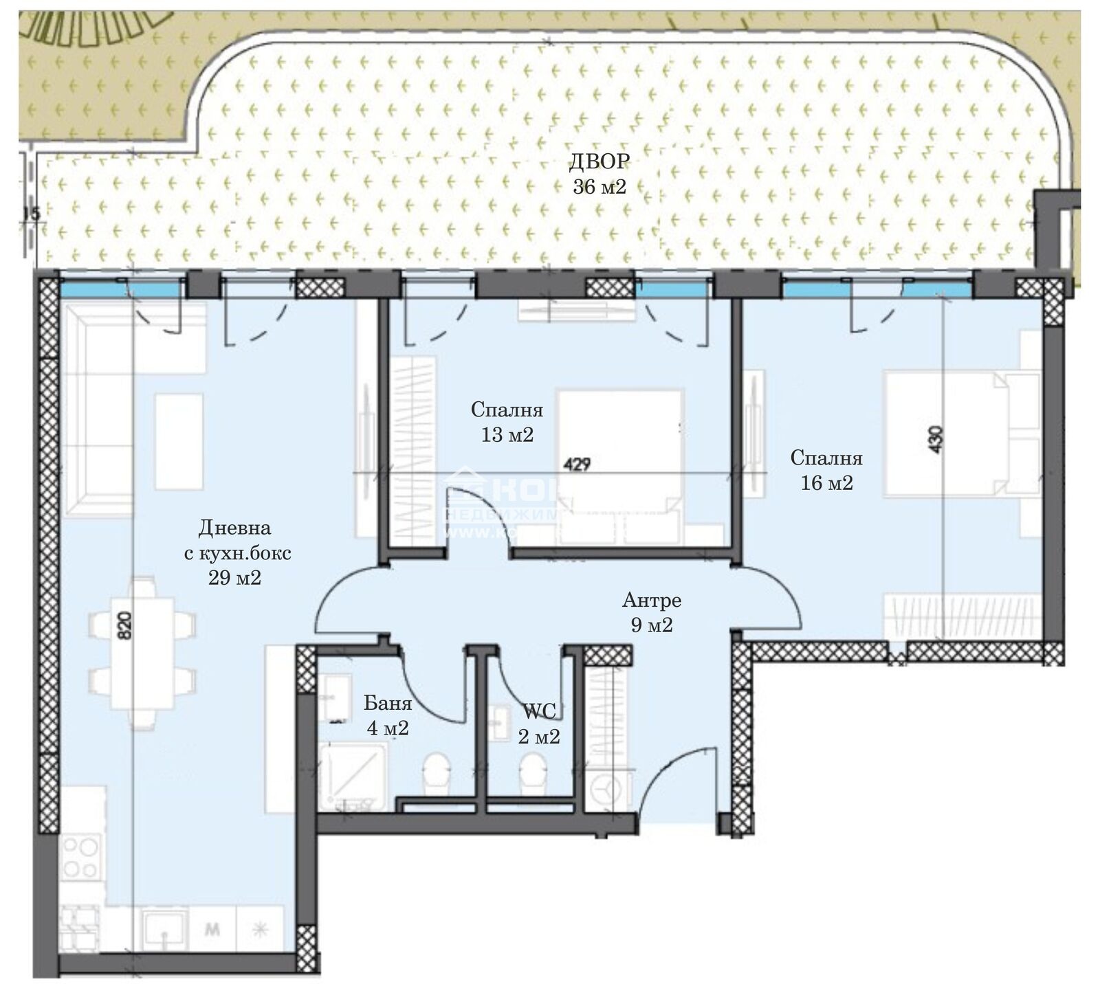 Оферта 66834: Предлагаме Ви възможността да закупите тристаен апартамент в новоизграждащ се луксозен жилищен комплекс с модерна визия, проектиран да създаде максимален комфорт на живущите в него. Функционално разположени жилищни секции с елегантен силует готов да предложи комфорт и модерен начин на живот. Едно от основните му предимства е страхотната локация, отлична комуникативност и динамична пътна инфраструктура, която осигурява бърз и лесен достъп до комплекса от всяка точка на града. Той съчетава лукс, спокойствие и комфорт с подсигурени паркоместа и гаражи. Жилището се състои от просторна дневна/29кв.м./ с кухненска част и трапезария, две самостоятелни спални с площ от 13 и 16кв.м., баня с тоалетна, втора тоалетна, входно антре с място за гардероб и собствен двор 36кв.м. с достъп от всички стаи. Към апартамента има прилежащо избено помещение включено в цената. Основната концепция при проектирането е да се постигнат просторни и функционални стаи, с цел да се създаде максимален уют на модерното семейство. Изключителна съвременна архитектура и модерна технология на строителство. Визията е иновативна, привличаща внимание с уникалността си. Всяко жилище ще разполага с пълно окабеляване за домофон, интернет и кабелна телевизия, общите части са луксозно завършени, жилищата са с алуминиева дограма с троен стъклопакет от най-висок клас, масивна блиндирана входна врата. За удобство на живущите съществува възможността да закупят подземни паркоместа и гаражи с топла връзка към комплекса. Гъвкави схеми на разсрочено плащане спрямо възможностите на клиента в рамките на строителството или закупуване чрез Банков Кредит, на изключително изгодни условия за клиенти на агенцията !!! Приложените изображения са от завършени проекти на строителната фирма.