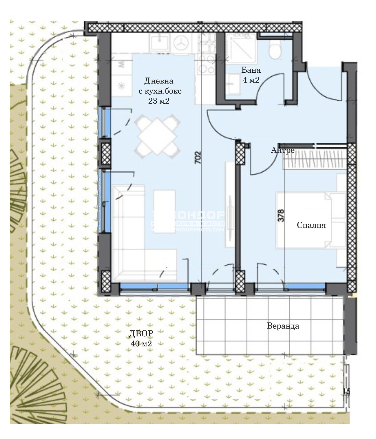 Оферта 66818: Предлагаме Ви възможността да закупите двустаен апартамент с изложение ЮГ/ЗАПАД в новоизграждащ се луксозен жилищен комплекс с модерна визия, проектиран да създаде максимален комфорт на живущите в него. Функционално разположени жилищни секции с елегантен силует готов да предложи комфорт и модерен начин на живот. Едно от основните му предимства е страхотната локация, отлична комуникативност и динамична пътна инфраструктура, която осигурява бърз и лесен достъп до комплекса от всяка точка на града. Той съчетава лукс, спокойствие и комфорт с подсигурени паркоместа и гаражи. Жилището се състои от ъглова югозападна дневна 23кв.м. с кухненска част и трапезария, една самостоятелна спалня, баня с тоалетна, входно антре с място за перално, веранда и собствен двор 40кв.м. Основната концепция при проектирането е да се постигнат просторни и функционални стаи, с цел да се създаде максимален уют на модерното семейство. Изключителна съвременна архитектура и модерна технология на строителство. Визията е иновативна, привличаща внимание с уникалността си. Всяко жилище ще разполага с пълно окабеляване за домофон, интернет и кабелна телевизия, общите части са луксозно завършени, жилищата са с алуминиева дограма с троен стъклопакет от най-висок клас, масивна блиндирана входна врата. За удобство на живущите съществува възможността да закупят подземни паркоместа и гаражи с топла връзка към комплекса. Гъвкави схеми на разсрочено плащане спрямо възможностите на клиента в рамките на строителството или закупуване чрез Банков Кредит, на изключително изгодни условия за клиенти на агенцията !!! Приложените изображения са от завършени проекти на строителната фирма.ВИЖТЕ ОЩЕ ИЗГОДНИ ОФЕРТИ НА https://www.kondorimoti.com/ С ЕЖЕДНЕВНА АКТУАЛИЗАЦИЯ!