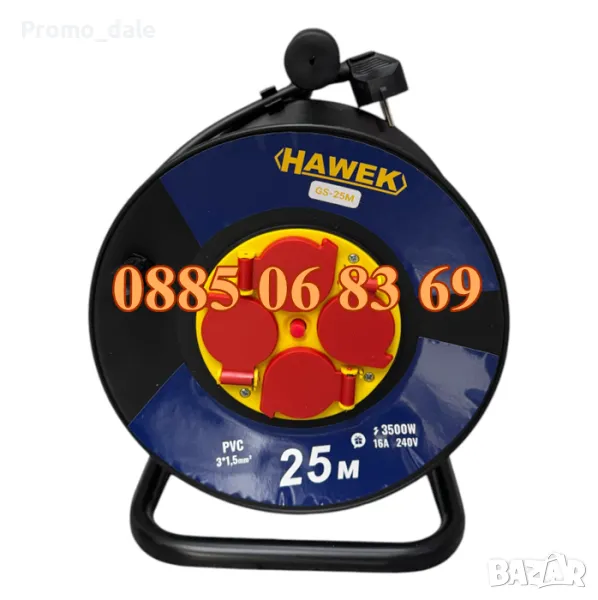 Макара с кабел 25 метра ( удължител ) HAWEK позволява захранването на няколко устройства едновременно, което пък улеснява извършването на Вашите задачи. Тя е подходяща за всеки дом и е изключително компактна и практична. Дължината на кабела е 25 метра, като напречното сечение на проводника е 3 х 1.5 мм2. Максималното натоварване на кабела ( по предоставени данни от производителя ) е 16А, но само ако целият кабел е развит от макарата. Ако се използва частично навит кабел, максималното натоварване се намалява до 4.5 А, поради индукцията на кабела. Макарата е снабдена с 4 броя контакти, позволяващи включването на максимум 4 устройства.
